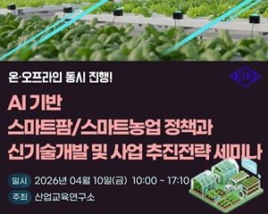 최근 기후변화와 식량안보, 농업 인력 부족 등으로 농업 환경이 빠르게 변화하고 있다. 이에 따라 농업은 디지털 기술과 결합한 새로운 산업으로 전환되고 있으며 AI, 데이터, 자동화 기술을 접목한 스마트팜과 스마트농업이 미래 산업으로 부상하고 있다. 또한 생산성 향상과 안정적 농업 경영을 동시에 실현할 수 있는 대안으로 주목받고 있다. 이러한 흐름에 따라 산업교육연구소는 4월 10일(금)에 “AI 기반 스마트팜·스마트농업 정책과 신기술개발 및 사업 추진전략 세미나”를 온·오프라인 동시 개최한다고 밝혔다.