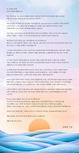 최태원 SK그룹 회장이 2026년 신년사를 통해 “AI라는 거대한 변화의 바람을 타고 글로벌 시장의 거친 파도를 거침없이 헤쳐 나가자”고 밝혔다.