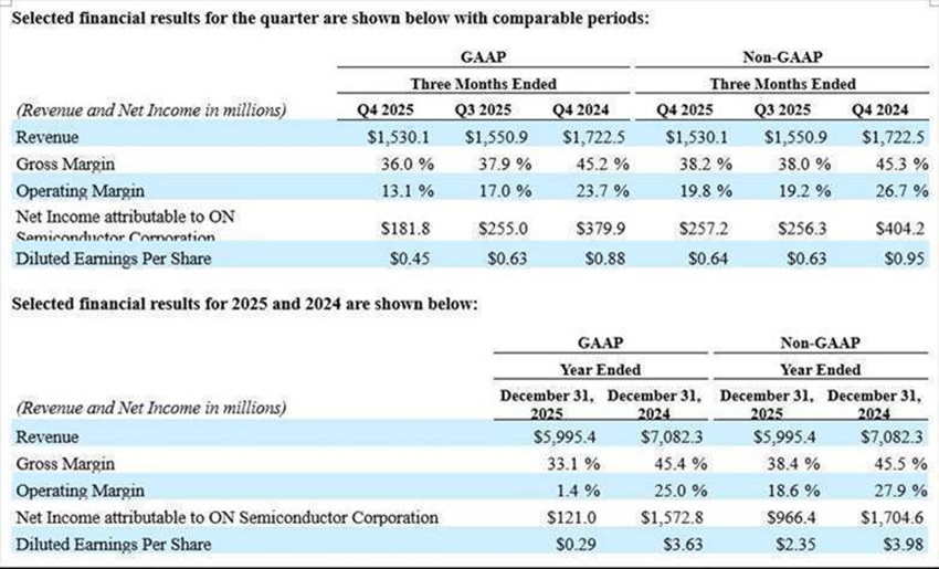 2025년 4분기 온세미의 매출은 15억3천만 달러를 기록했으며, 같은 기간 일반회계기준(GAAP)과 비일반회계기준(non-GAAP) 총이익률은 각각 36%, 38.2%를 나타냈다. 영업이익률 역시 GAAP 기준 13.1%, non-GAAP 기준 19.8%로 안정적인 수익성을 유지했다. 4분기 희석주당이익(EPS)은 GAAP 기준 0.45달러, non-GAAP 기준 0.64달러를 기록했다.