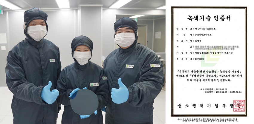 아이브이웍스(대표 노영균)가 전력반도체 원천 소재인 ‘질화갈륨(GaN) 단결정 웨이퍼 제조기술’로 녹색기술 인증을 취득했다고 2월 12일 밝혔다.