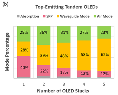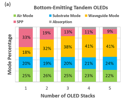 광학적 측면에서도 구조적 상충관계가 존재한다. 전하생성층 및 다층 유기막의 삽입은 광학적 간섭 효과를 유발하여 발광 스펙트럼과 광 추출 효율에 영향을 미친다. 광 모드(Optical modes)에는 유기층 및 고굴절률 ITO 내부에 빛이 가둬지는 Waveguide 모드, 금속 전극에서 광 에너지가 플라즈몬으로 소멸되는 표면 플라즈몬(SPP, Surface plasmon polariton) 모드 그리고 기판 내부 전반사로 인해 외부 방출이 불가해지는 substrate 모드가 있다. 단일 스택 OLED에서 탠덤 OLED로 변화하면서 SPP 모드는 30%에서 10% 이하로 떨어져 탠덤 OLED에서는 waveguide 모드가 주 광 손실 모드가 된다. 배면 발광 OLED의 경우 41%의 빛이 waveguide 모드에 의해 갇히게 되며 24%가 substrate 모드에 의해 갇힌다. 전면 발광 OLED의 경우에는 substrate 모드와는 무관하지만 60%이상의 빛이 waveguide 모드에 의해 갇힌다(그림 11 참조).