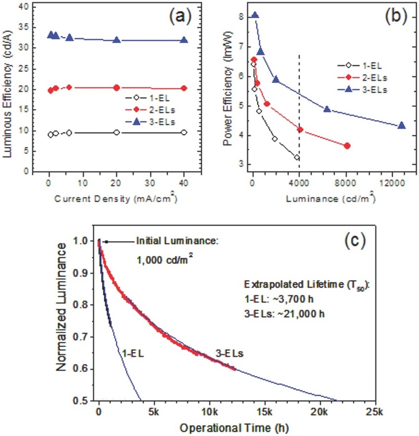 그림 3. 전계발광 유닛 수에 따른 성능 (a) 발광 효율, (b) 전력 효율, (c) 동작 수명 [6]