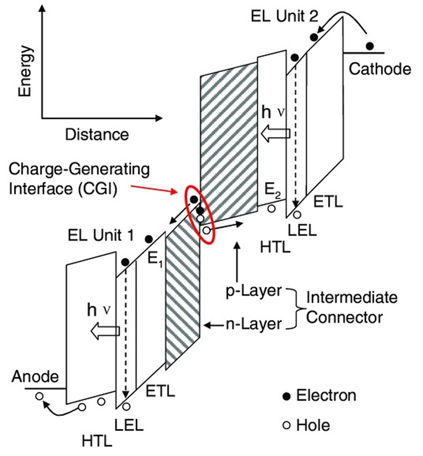 탠덤 OLED는 두 개 이상의 전계발광 유닛을 직렬로 적층한 구조로, 기존 단일 스택 OLED의 한계를 구조적으로 보완하기 위해 제안되었다. 전계발광 유닛(EL unit, Electroluminescence unit) 사이에 삽입된 전하 생성층은 전자와 정공을 동시에 생성하며, 생성된 전하는 분리되어 각각 인접한 발광 유닛으로 주입됨으로써 다중 발광 유닛의 구동을 가능하게 한다.