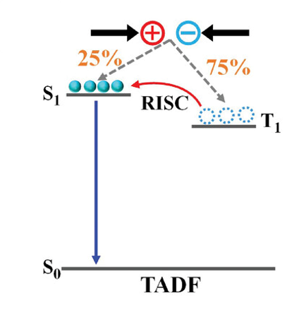 열 활성화 지연 형광은 일중항과 삼중항 여기자의 에너지 차이를 최소화함으로써, 삼중항 여기자가 열 활성화된 역계간전이(RISC, Reverse Intersystem Crossing)를 통해 다시 일중항으로 전환된 후 발광에 기여하도록 한다(그림 9 참조). 이로 인해 열 활성화 지연 형광 발광체 역시 일중항과 삼중항 여기자를 모두 활용할 수 있으며, 이론적으로 내부 양자 효율 100% 달성이 가능하다. 또한 귀금속을 사용하지 않는 발광체를 통해 고효율을 구현할 수 있어 비용 측면에서 경쟁력을 가진다. [5]
