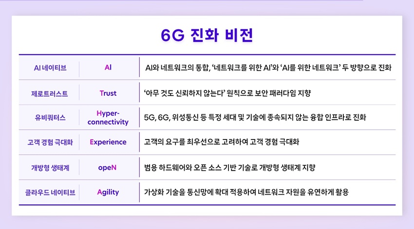 SKT는 이번 백서에서 △AI 기술의 네트워크 통합(AI 네이티브) △제로트러스트 보안 △5G?6G?위성통신을 아우르는 융합 인프라(유비쿼터스) △개방형 생태계 △가상화 기반 유연성(클라우드 네이티브) △고객 경험 극대화 등 6가지 방향을 네트워크 진화 비전의 핵심 축으로 제시했다.