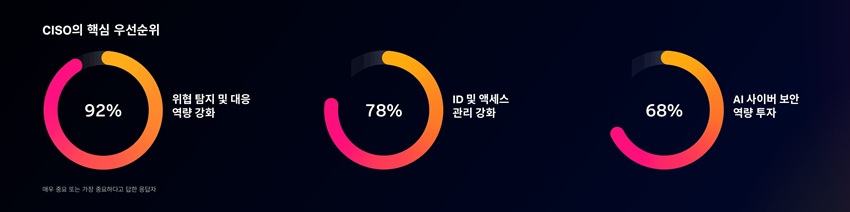 - 공격자 역량 고도화에 대응: CISO의 95%는 공격자 역량의 고도화를 최대 리스크로 지목했다. 또한 위협 탐지 및 대응 역량 강화(92%), ID 및 액세스 관리 강화(78%), AI 사이버 보안 역량 투자(68%)를 주요 우선순위로 꼽았다.