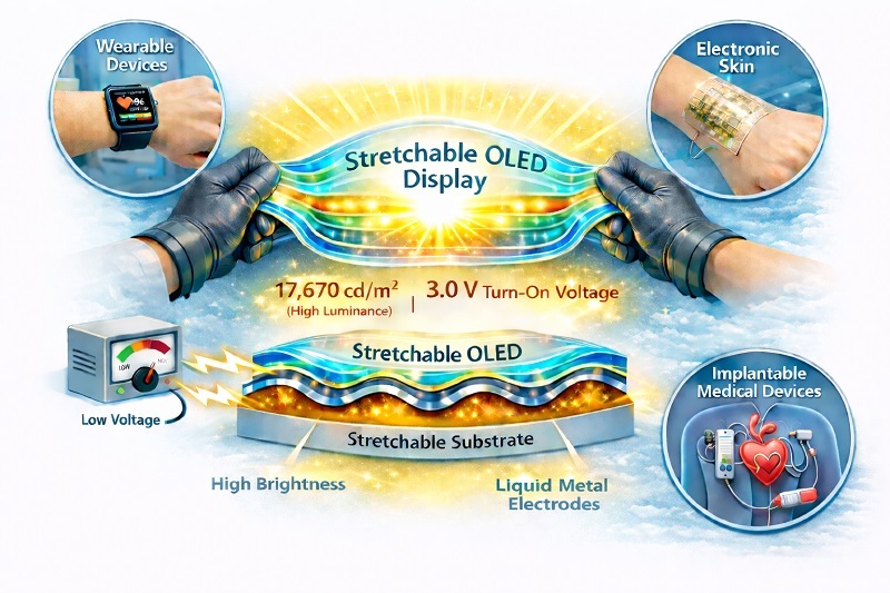 KAIST(총장 이광형)는 신소재공학과 조힘찬 교수 연구팀이 늘어나도 전기가 끊기지 않는 새로운 전극 기술을 개발했다고 3월 3일 밝혔다. 전극은 OLED에서 빛을 내기 위해 전기를 공급하는 핵심 부품이다. 연구팀은‘하이브리드 액체 금속 음극(전자를 공급하는 전극)’을 적용해 성능 저하 없는 차세대 신축성 OLED를 구현했다. 기존 신축성 OLED에서의 음극은 효율적인 전자 공급과 우수한 기계적 신축성을 동시에 만족하기 어려웠다.