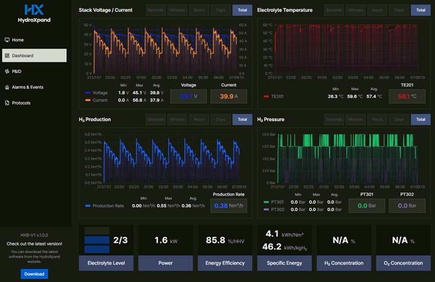 HXB-V1은 실험실, 파일럿 사이트, 소규모 산업 현장에서 사용할 수 있도록 설계된 컴팩트형 수소 생산 시스템이다. 시스템에는 전용 데스크탑 앱이 적용돼 장비 상태 확인, 실시간 데이터 모니터링, P&ID 기반 제어, 알람 및 이벤트 관리, 자동 운전 프로토콜 설정이 가능하다. 사용자는 전류, 전압, 전해질 온도, 전해질 유량 등 주요 운전 변수를 직접 조정할 수 있으며, 운전 시퀀스를 저장·불러오기 해 반복 실험과 자동 운전에 활용할 수 있다.