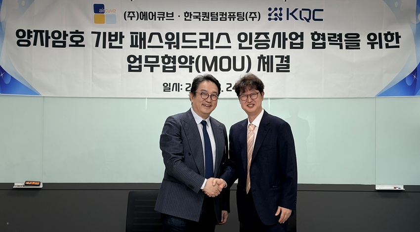 한국퀀텀컴퓨팅(이하 KQC, 대표 김준영)은 3월 25일, 에어큐브(대표 김유진)와 PQC(Post-Quantum Cryptography, 양자내성암호) 기반 패스워드리스(Password-less) 인증 사업 협력을 위한 전략적 업무협약(MOU)을 체결했다고 밝혔다.