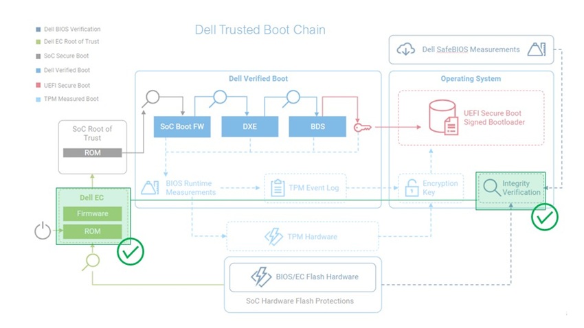 델은 이번 업데이트를 통해 핵심 하드웨어 보안 구성 요소인 임베디드 컨트롤러(EC)를 강화하여, 양자 위협에 내성을 가진 서명으로 펌웨어 업데이트를 검증하는 방식을 지원한다. 강력한 암호 알고리즘으로 서명된 모든 EC 펌웨어 이미지를 BIOS에서 1차로 검증한 뒤, EC 자체에 내장된 공개키로 2차 검증하여, 서명되지 않았거나 변조된 펌웨어가 실행되지 않도록 차단하는 식이다. 이러한 강력한 암호화와 디지털 서명을 기반으로 공급망 보안 리스크도 줄일 수 있다고 전했다.