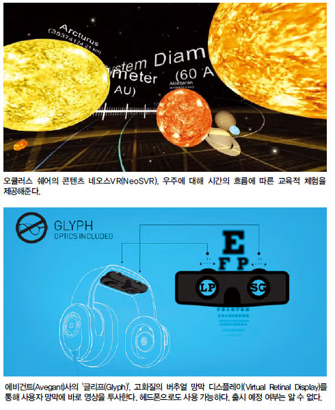 에비건트(Avegant)사의 죖글리프(Glyph)’의 경우엔 고화질의 버추얼 망막 디스플레이(Virtual Retinal Display)를 통해 사람 망막에 화면을 바로 쏜다. 독자적인 기술력을 갖춘 것이다. VR헤드셋이지만 헤드폰으로도 사용 가능하다. 그러나 실제로 제품이 출시될 지는 미지수다.
