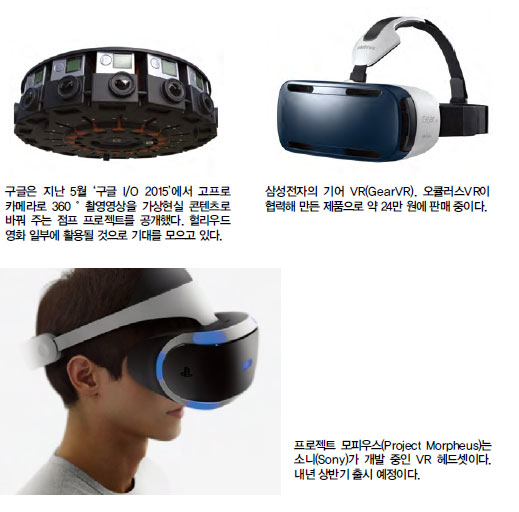 이보다 훨씬 저가인, 대략 20,000원에 판매되는 구글의 VR 카드보드도 주목해야할 제품이다. 작년 출시돼 ‘골판지 VR’로 불리는 이 제품은 예상한 것보다 뛰어난 성능을 자랑한다. Full HD를 지원하는 스마트폰을 삽입하고 관련 앱을 설치해 이용할 수 있다.