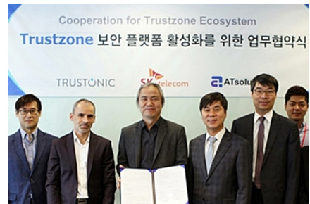 SK텔레콤(대표이사 사장 장동현, www.sktelecom.com)은 세계적 보안솔루션 개발 업체인 영국의 트러스토닉(Trustonic)사, 국내 중견 보안 솔루션 업체인 에이티솔루션즈사와 함께 트러스트존(TrustZone) 서비스 플랫폼을 활용한 보안 서비스 생태계 구축 관련 업무협약(MoU)을 체결했다.