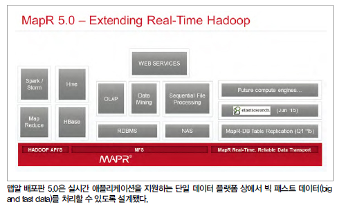 맵알 배포판 5.0은 실시간 애플리케이션을 지원하는 단일 데이터 플랫폼 상에서 빅 패스트 데이터(big and fast data)를 처리할 수 있도록 설계됐다.