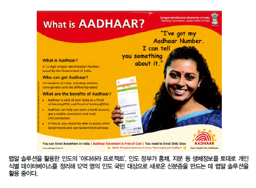 아다하라 프로젝트는 인도 국민 12억 명에 개인 정보를 부여하는 정부 사업이다. 우리나라처럼 주민등록번호를 생성해 효율적인 행정 관리에 기여한다. 개인번호가 아닌 생체정보 즉, 지문인식 기반으로 사람을 식별한다. 각 지문별 특징을 구별해 그룹화하는 것이다. 쉽게 말하면 공통 요소와 차이점을 나눠 개인이 가진 특정 정보를 저장·관리하는 셈이다.”