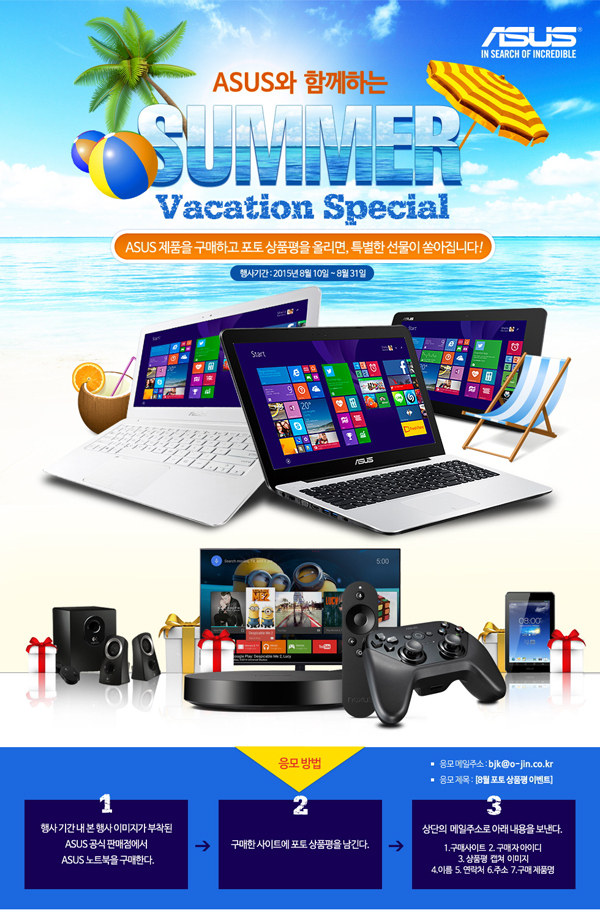 에이수스 썸머 바캉스 스페셜 이벤트에 참여하고자 하는 고객은 행사 기간 중 옥션을 통해 이벤트 대상 에이수스 노트북 제품을 구매하고 사이트 하단에 포토 상품평을 남기면 된다. 포토 상품평을 남긴 구매 고객은 구매 사이트와 구매자 아이디, 상품평 캡처 이미지 등 참가 정보(구매 홈페이지 참조)를 응모 메일주소(bjk@o-jin.co.kr)로 보내면 응모가 완료된다. 이벤트와 관련한 자세한 사항은 이벤트 페이지(http://bit.ly/1IJnAFd)에서 확인할 수 있다.