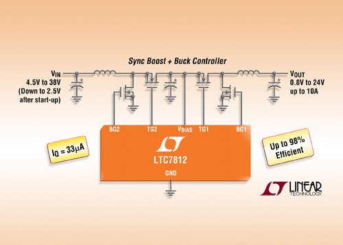 LTC7812는 4.5V ~ 38V의 입력 전압으로 동작하며 기동후에는 2.5V까지 낮아진 전압에서도 동작이 유지된다. 동기식 부스트 컨버터는 최대 60V까지 출력 전압을 생성할 수 있으며 최대 효율을 요구할 경우 입력 전압이 통과되는 0% 듀티 싸이클(동기식 스위치 ON) 로 동작시킬 수 있다. 스텝다운 컨버터는 98%의 고효율로 0.8V ~ 24V 범위의 출력 전압을 생성할 수 있다.