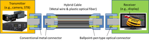 일본 게이오 대학 벤처기업인 카이 포토닉스(KAI Photonics Co., Ltd.)와 제휴한 파나소닉은 “플라스틱 광섬유와 볼펜 타입의 상호접속 광섬유 연결 기술*2”을 적용한 커넥터 장착 케이블을 개발했다. 또한 파나소닉의 광대역 신호 다중레벨 변조(multi-level modulation) 기술을 적용함으로써 단일 케이블로 100 Gbps를 초과하는 전송 대역폭을 실현하였다.