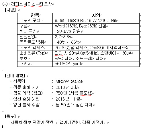 현재 샘플 출하중이며, 회로 설계, 테스트 프로그램 설계, 평가 등의 플래시 메모리 개발은 라피스 세미컨덕터 (신요코하마 테크놀로지 센터)에서 실시, 생산은 해외 파트너 Fab에 위탁, 2016년 11월부터 양산 출하를 개시할 예정이다.