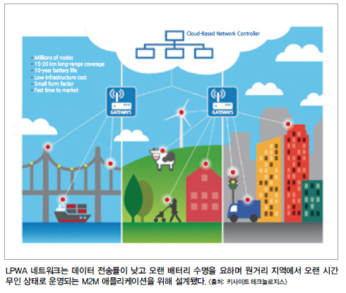 IoT의 통신 부분을 담당하는 대표적인 기술에는 무선 LAN, 지그비(ZigBee), 블루투스 LE(Bluetooth Low Energy), Wi-SUN 등의 근거리 무선통신 기술과 2G, 3G, 4G 등의 이동통신 기술이 있지만, LPWA 네트워크는 데이터 전송률이 낮고 오랜 배터리 수명을 요하며 원거리 지역에서 오랜 시간 무인 상태로 운영되는 M2M 애플리케이션을 위해 설계됐다. 따라서 안전 감시, 용수 및 가스 계량, 스마트 그리드, 주차장, 자판기, 가로등, 웨어러블 기기 등 광범위한 애플리케이션에 사용할 수 있다.