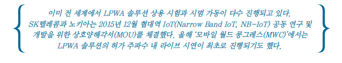 이미 전 세계에서 LPWA 솔루션 상용 시험과 시범 가동이 다수 진행되고 있다. SK텔레콤과 노키아는 2015년 12월 협대역 IoT(Narrow Band IoT, NB-IoT) 공동 연구 및 개발을 위한 상호양해각서(MOU)를 체결했다. 올해 ‘모바일 월드 콩그레스(MWC)’에서는 LPWA 솔루션의 허가 주파수 내 라이브 시연이 최초로 진행되기도 했다.
