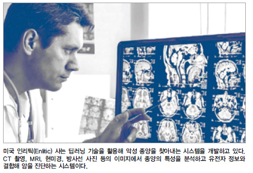 미국 샌프란시스코의 스타트업 인리틱(Enlitic)은 딥러닝(Deep Learning) 기술을 활용해 악성 종양을 찾아내는 시스템을 개발하고 있다. CT 촬영, MRI, 현미경 사진, 방사선 사진 등의 이미지에서 종양의 특성을 분석하고 유전자 정보와 결합해 단시간에 암을 진단하는 시스템이다.