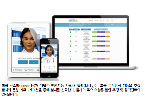 미국 샌프란시스코 소재 벤처기업 센스리(sense.ly)가 개발한 인공지능 간호사 ‘몰리(Molly)’는 간호사의 아바타로 고급 음성인식 기능을 갖춰 환자와 음성 커뮤니케이션을 통해 환자를 간호한다. 환자는 몰리의 지시에 따라 혈압을 재고 약을 복용하고 화상회의를 통해 의사에게 진찰을 받게 된다. 몰리의 주요 역할은 혈압 측정 및 원격진료의 일정관리다.