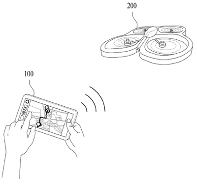 〈그림 1〉은 스마트폰의 앱(100)을 이용해 UI/UX로 200의 UAV를 제어하는 환경을 나타낸 것이다. 디지털 디바이스 100은 스마트폰, 태블릿, 컴퓨터 혹은 PDA가 될 수 있으며, UAV는 2개의 로터(rotors)를 가진 혹은 4개 혹은 8개를 가진 UAV가 될 수도 있다.