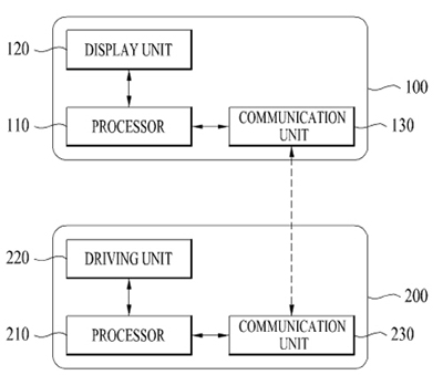 〈그림 2〉는 100의 스마트폰과 200의 UAV의 구성요소들로, 120은 디스플레이 장치, 110은 프로세서, 130은 커뮤니케이션 장치이고, 220은 로터 등의 추진장치다.