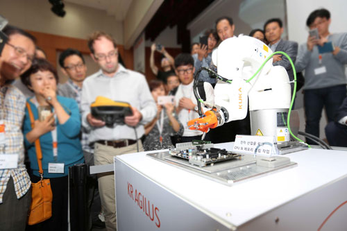 국내에 처음으로 소개되는 KR3 아길러스는 쿠카의 선진 기술이 집약된 소형 로봇이다. 빠른 속도와 높은 정밀성으로 섬세한 작업을 요하는 전자산업의 생산 라인에 최적화됐다. 이날 세미나에서는 토크센서를 이용해 인쇄회로기판(PCB)의 작은 전자부품을 조립하는 작업 과정을 직접 선보임으로써, 실제 작업장에서의 활용 방향을 제시했다.
