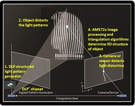 TI의 새로운 Sitara™ AM572x 프로세서 시스템온칩(SoC)과 DLP LightCrafter™ 4500 평가 모듈(EVM)을 결합하면 임베디드 3D 머신 비전 솔루션을 제공할 수 있다. TI는 DLP 기술 구조광을 갖춘 AM572x 프로세서 SoC 기반의 3D 스캐너용 TI Design 레퍼런스 디자인을 선보였으며, 이 시스템에서는 AM572x 프로세서 SoC에서 모든 프로세싱이 처리된다. 다음의 그림은 이 시스템에 대해 간략하게 설명한다.