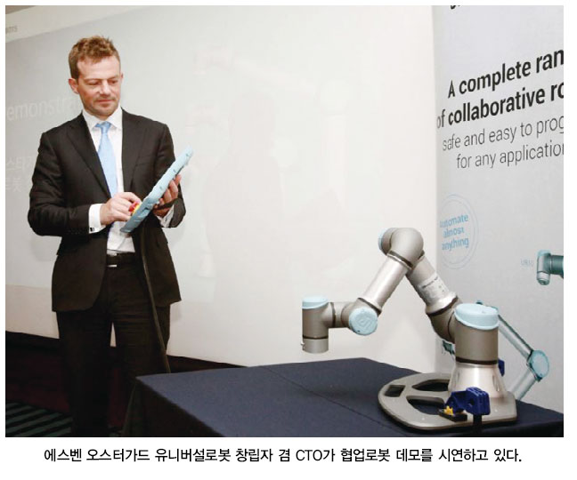 ‘로봇월드 2016’ 참석차 한국에 방문한 유니버설로봇(Universal Robots)의 창립자 겸 CTO인 에스벤 오스터가드(Esben Østergaard)는 10월 13일 기자간담회를 갖고 “유니버설로봇이 궁극적으로 지향하는 방향성은 공장 내의 로봇을 협업로봇으로 대체하는 것”이라며 “로봇 기술을 통해 안전장치 없이 인간과 함께 같은 공간에서 일할 수 있도록 하는 것이 바로 협업로봇”이라고 설명했다.
