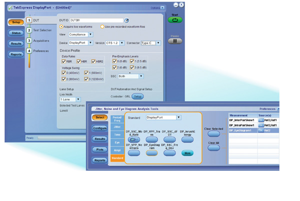 TekExpress 프레임워크를 사용하면 단일 패널을 사용하는 간소화된 사용자 환경을 통해 DUT(테스트 대상 장치)를 구성할 수 있다. 또한 여기에는 Unigraf DPR-100 레퍼런스 싱크 보조 컨트롤러를 사용한 DUT 자동화 지원 기능이 포함되어 있다. 향상된 보고 옵션 기능들을 사용하면 .html, .mht, .pdf 및 .csv 형식으로 보고서를 생성할 수 있다. .csv 형식으로 데이터를 기록할 경우 라이브 및 오프라인 파형 분석 기능을 사용하여 결과를 수집한 후 시스템 동작을 심층적으로 분석하는 데 도움이 된다.