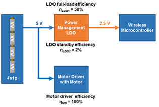 그림 1은 TPS76625 같은 LDO를 사용한 스마트 도어록의 기본적인 블록 다이어그램을 보여준다. 엔지니어들이 LDO를 선택하는 것은 가격 때문이다. 대부분의 경우 LDO의 IC 가격은 벅(스텝다운)이나 부스트(스텝업) 컨버터 IC보다 저렴하다. 하지만 선형 회로는 효율이 떨어지므로 배터리 수명을 단축한다.