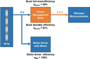 그림 3은 벅 컨버터를 사용했을 때의 블록 다이어그램이다. 효율 수치는 TPS62745 초저전력 벅 컨버터를 사용했을 때 제공되는 것이다. 초저전력 컨버터를 사용하면 시스템의 대기 모드에서 효율을 크게 향상시킬 수 있다. 스마트 도어록은 도어록을 열고 닫을 때를 제외하고는 거의 대부분의 시간은 대기모드다.