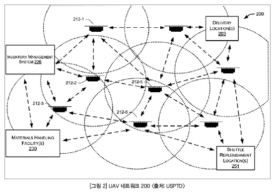 그림 2는 UAV 네트워크 200을 설명하는 그림으로, 212-1~N은 무인기, 203은 배송위치들, 251은 셔틀보충위치들(Shuttle Replenishment Locations), 230은 지상의 물류 핸들링 시설들, 226은 재고관리시스템이 포함돼 있다. 이들은 상호 커뮤니케이션 한다. 커뮤니케이션 하는 방법은 고도에서는 GPS, 지상에서 30미터 접근할 때는 셀룰러, 30미터 이내에서는 Wi-Fi, 10 cm 내에서는 배송 위치에 부착된 비콘이나 LED/초음파/적외선 센서 등이 보내는 신호를 이용한다. 이외에도 날씨와 기상 정보 등을 공유한다.