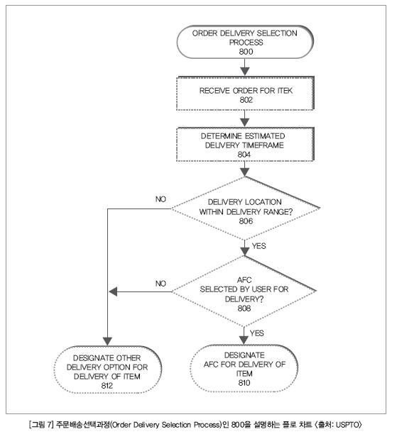 그림 7은 주문배송선택과정(Order Delivery Selection Process)인 800을 설명하는 플로 차트다. 802의 블록은 사용자로부터 아이템 주문을 받는 과정이다. 804는 배송하는 데 걸리는 시간을 예측해 결정하는 과정이다. 이 과정은 AFC에 주문한 아이템이 있는지, 있다면 AFC에서 UAV를 기동해 사용자가 지정한 배송 위치까지 배송하는 데 걸리는 시간을 예측하는 것이다. 또한 AFC에 아이템이 없다면 지상의 물류 핸들링 시설에 있는지, 있다면 셔틀을 AFC에 보내 배송하는 데 걸리는 시간을 예측하고 판단하는 것이다.