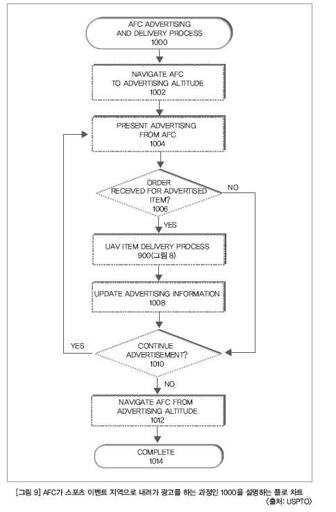 그림 9는 AFC가 스포츠 이벤트 지역으로 내려가 광고를 하는 과정인 1000을 설명하는 플로 차트다. 1002에서 AFC가 광고를 할 수 있는 고도까지 하강하는 것을 내비하는 과정이다. 매우 높은 4만 5,000피트(약 1만 371미터=13 km)에서 내비하여 관중들이 광고를 잘 보이는 고도까지 하강하는데, 대략 2,000피트(609.60미터)까지 하강한다. 이 정도 고도이면 일반 항공기들의 고도가 아니어서 충돌을 피할 수 있다. 이 정도 고도는 관중들이 광고를 잘 볼 수 있다.