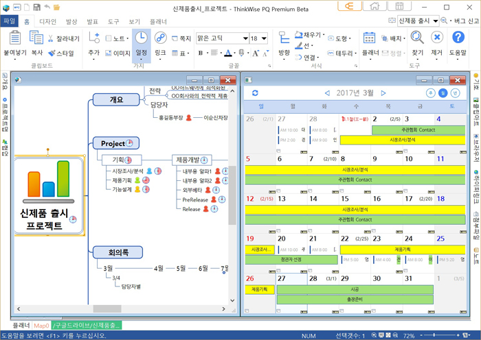 씽크와이즈 PQ는 기존 제품과 비교해 세 가지를 중점적으로 개선했다. 첫째, 사용자 편의를 위한 추가 기능과 인터페이스를 개선했다. 둘째, 공유와 협업 기능을 강화했다. 셋째, 맵과 플래너를 한 화면에 보면서 전체 구조와 일정을 관리할 수 있으며 구글 클라우드와 캘린더를 연동했다.