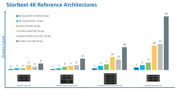 철저하게 실제 사용 환경에서 진행된 퀀텀의 테스트에는 6 개 미디어 포맷 기반의 14 가지 스토리지 설정이 포함됐다. 특히 평가를 위해 전체 스토리지 사용 용량의 30% 미만을 요구하는 YUV 영상 포맷 데이터가 아니라, 고품질 RGB 영상 포맷 데이터를 사용해 용량의 85%를 채운 스토리지 어레이를 기준으로 했다. 이 테스트를 통해 퀀텀은 스토어넥스트(StorNext) 기반 디스크 드라이브 및 어레이의 스트림 수와 성능 수준을 결정할 수 있었으며, 이를 통해 활용 목적에 따라 사용할 수 있는 아래와 같은 4개의 4K 레퍼런스 아키텍처를 새롭게 선보이게 됐다.
