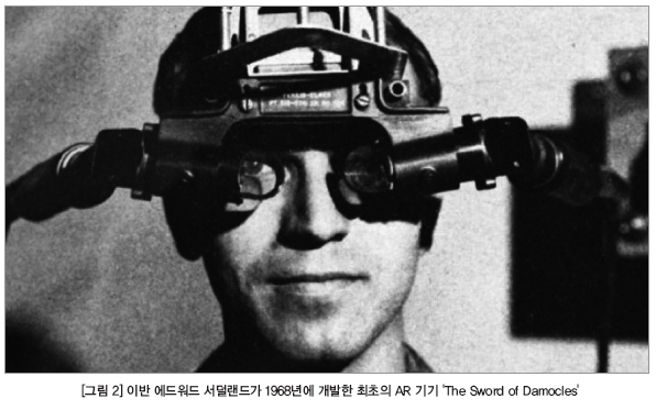 한편 AR의 역사는 1901년, ‘오즈의 마법사’의 원작자인 라이먼 프랭크 바움(Lyman Frank Baum)이 현실세계를 비춘 영상에 사람이 만든 데이터를 덧붙여 표현하는 ‘캐릭터 마커’라는 전자 기기를 고안한 것에서부터 출발한다. 첫 번째 AR 기기는 이반 에드워드 서덜랜드(Ivan Edward Sutherland)가 1968년에 개발한 HMD(Head Mounted Display)로, 전투기 조종사의 눈앞 렌즈를 통해 다양한 정보를 제공하는 역할을 했다.