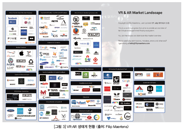 가상현실(이하 VR)과 증강현실(이하 AR) 산업은 IT를 비롯해 콘텐츠, 서비스 및 유통, 통신망, 전자기기까지 다양한 산업을 폭넓게 포함하고 있다.