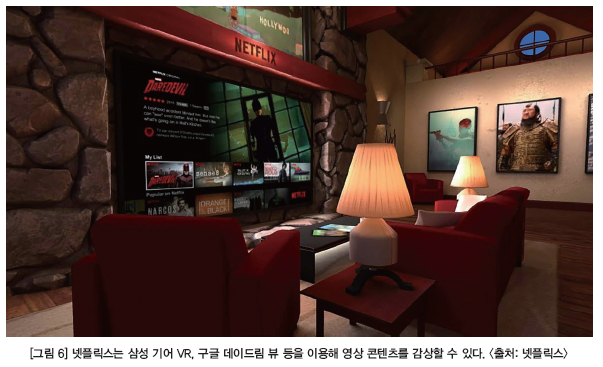 미국 캘리포니아에 위치한 넷플릭스(Netflix)는 방송 스트리밍을 주 사업모델로 하고 있다. 넷플릭스는 최근 자체적으로 VR 부서를 만들어 운영하고 있는데, VR 헤드셋을 통해 드라마와 영화 등을 시청할 수 있는 콘텐츠를 개발하고 있다.