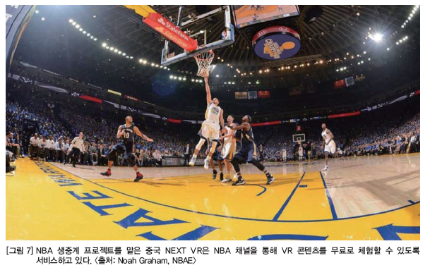 또한 미국 프로농구협회인 NBA에서는 현재 VR·AR 기술이 활용될 수 있는 실시간 중계를 개발 중이다. VR·AR 기술로 스포츠 중계를 시청할 수 있다면, 직접 경기장을 방문하지 못하는 이용자들이 현장감을 느끼며 스포츠를 즐길 수 있는 계기를 마련하게 된다.