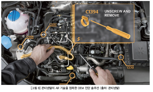 AR HUD는 자동차 속도, 내비게이션 정보뿐만 아니라 주변 자동차, 사물, 사람, 물체 뒤에 가려진 오토파이나 사람 등도 표시해준다. 또한 콘티넨탈은 자동차 진단 및 서비스 솔루션으로 OEM 진단에 AR 기술을 접목했다. AR 솔루션은 직관적인 작업 중심의 사용자 경험에 진단 및 기술 정보를 원활하게 통합하는 온라인 정보 시스템으로, 분석이 필요한 부품과 구성요소 등이 디스플레이에 표시돼 단계별 진단과 수리가 가능하다.