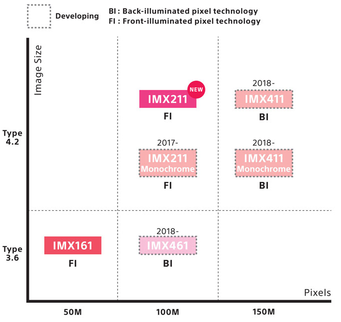 소니의 이미지 센서 설계 및 제조를 담당하고 있는 소니 세미컨덕터 솔루션(Sony Semiconductor Solutions)은 'CeBIT 2017'에서 2018년까지의 이미지 센서 개발 로드맵을 발표했다. 이 로드맵에는 중형포맷 카메라용 100 MP(Mega Pixel) 후면조사형(BSI: BackSide Illumination) CMOS 이미지 센서(IMX211, 흑백)에 대한 내용을 포함하고 있다.