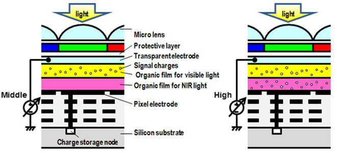 파나소닉은 2월 9일, 적층형 유기 박막을 이용한 CMOS 이미지 센서로 근적외선(NIR: Near-Infrared) 영역의 감도를 전기적으로 바꿀 수 있는 전자 제어 기술을 개발했다고 발표했다. 이 기술은 이미지 센서의 모든 픽셀의 감도 파장 영역을 독자적인 적층형 구조를 갖는 유기 박막(이하 적층형 유기 박막)에 가해지는 전압을 변경해 동시에 제어할 수 있게 한다.