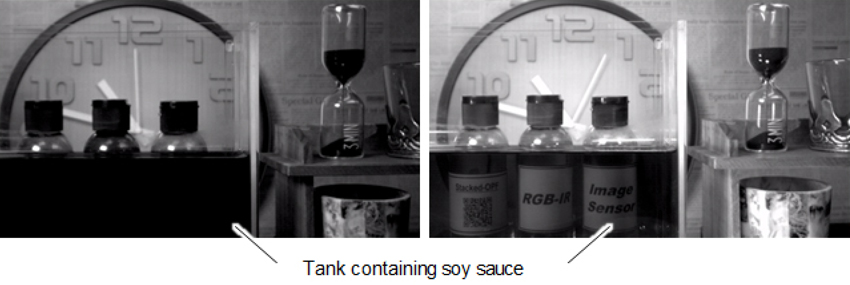 ▲ 그림 8. 컬러 이미징 모드(좌)와 NIR 이미징 모드(우). NIR 이미징 모드는 콩 소스로 채워진 작은 병에 붙은 레이블 위의 글자를 읽을 수 있게 한다. 〈출처: 파나소닉〉