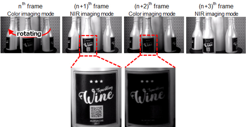 ▲ 그림 9. 이미지 센서의 유기층에 적용된 전압을 변경해 컬러 이미징 모드와 NIR 이미징 모드를 전환할 때 캡처한 회전 테이블 위의 병 프레임 이미지의 비교. 병의 라벨에 새겨진 QR 코드는 스펙트럼에 따라 다르게 반응하도록 특수 잉크로 인쇄했다. 병이 놓인 테이블이 회전하더라도 NIR 감도를 지닌 유기 이미지 센서는 병 레이블에 인쇄된 QR 코드를 선명한 이미지로 캡처할 수 있다. 〈출처: 파나소닉〉