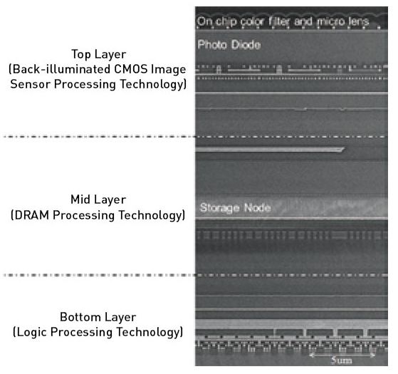 이에 앞서 2월 7일 , 소니 세미컨덕터 솔루션은 DRAM을 탑재한 스마트폰용 3단 적층형 CMOS 이미지 센서를 발표했다. 소니는 업계 최초로 개발한 3단 적층형 CMOS 이미지 센서는 전통적인 BSI 레이어와 신호처리 회로 부로 구성된 기존의 2단 적층형 CMOS 이미지 센서에 DRAM을 추가로 적층한 형태다.